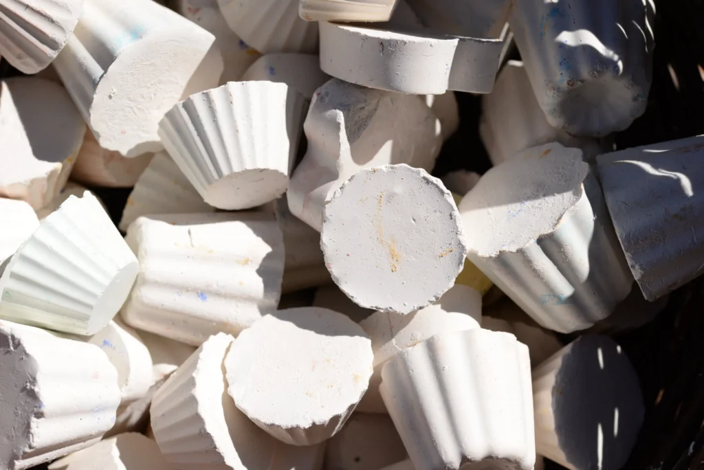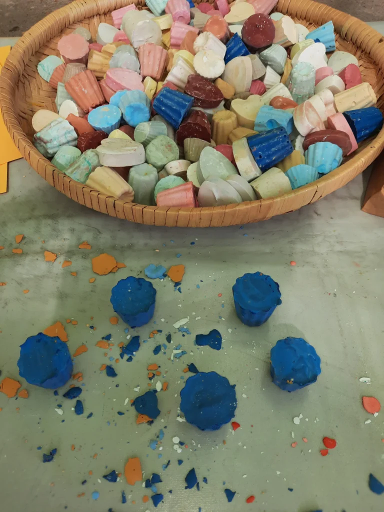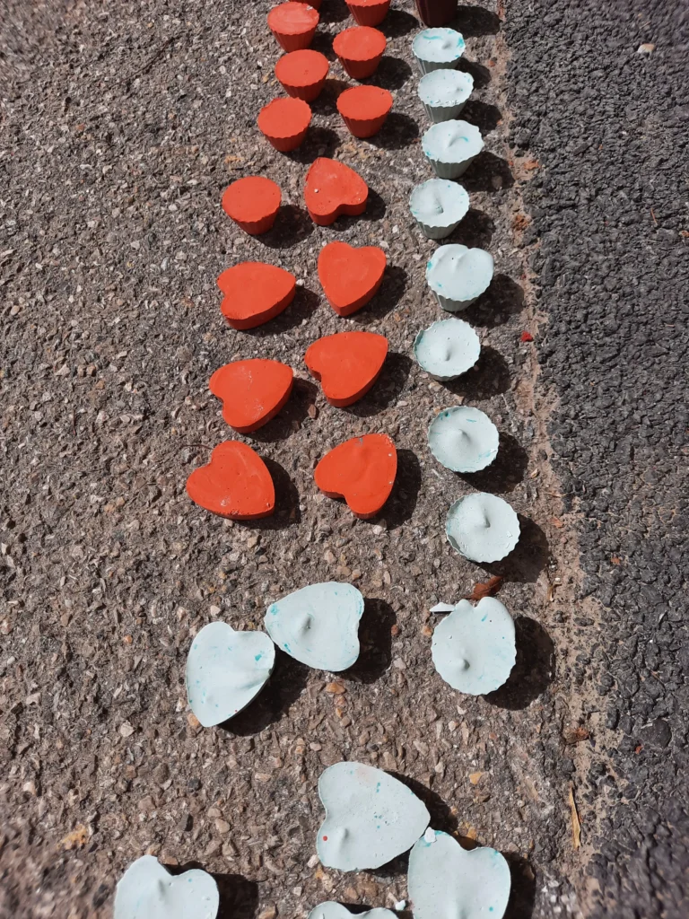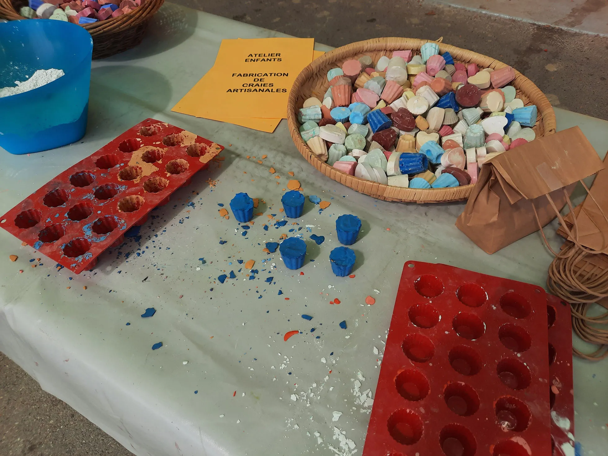 Cet atelier est en deux temps : il propose d’abord aux enfants de créer des craies artisanales de toutes les couleurs et de toutes les formes. Ils devront diluer les pigments dans de l’eau pour obtenir les couleurs souhaitées, puis faire les bons dosages et les mélanges de plâtre et de blanc de Meudon. Enfin ils rempliront les nombreux moules en latex aux formes variés, avant de les laisser sécher.