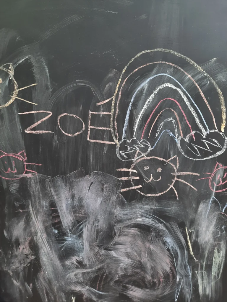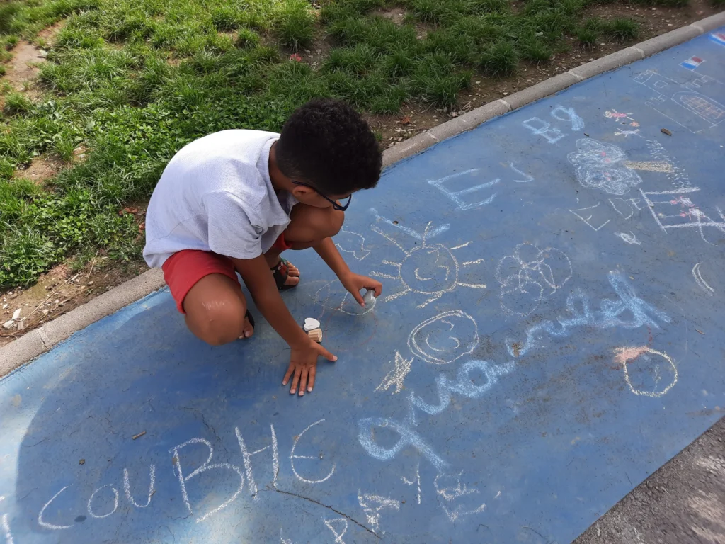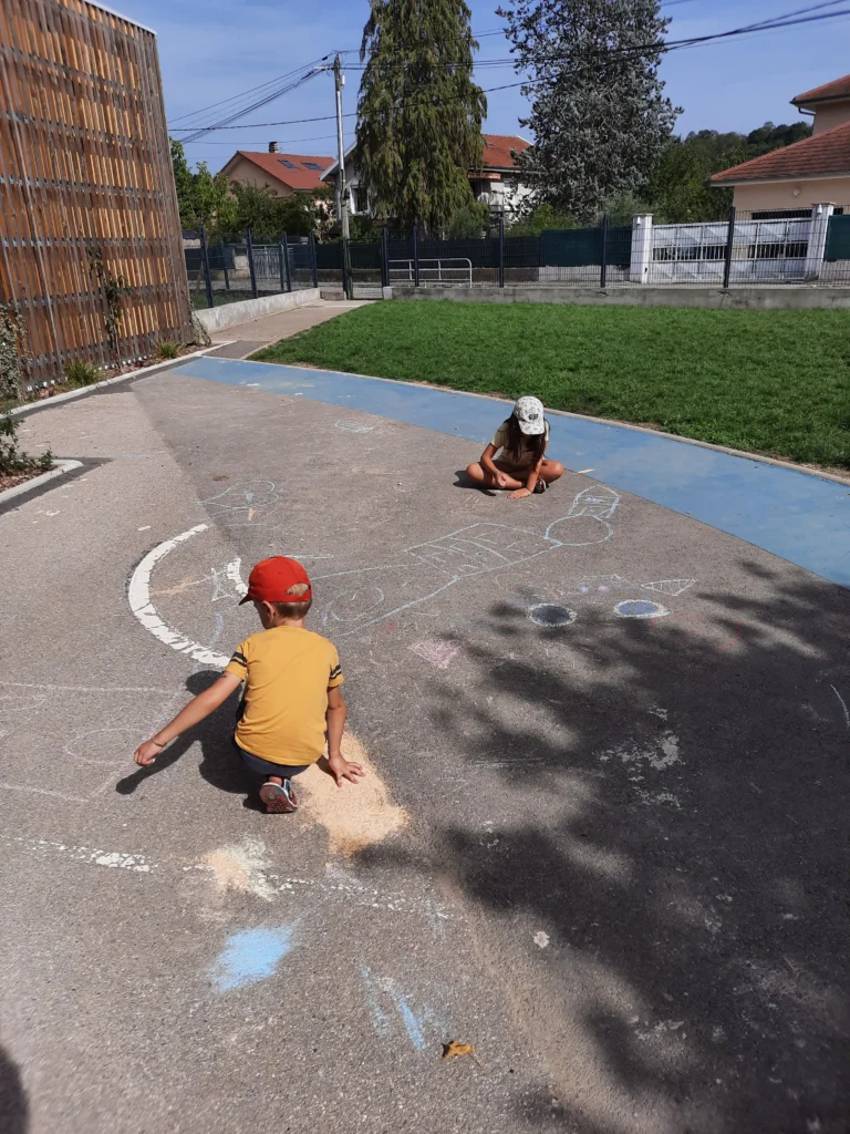 Dans un deuxième temps et pendant que les craies sèchent (en attendant leurs démoulage), les enfants sont invités à réaliser une fresque à la craie.